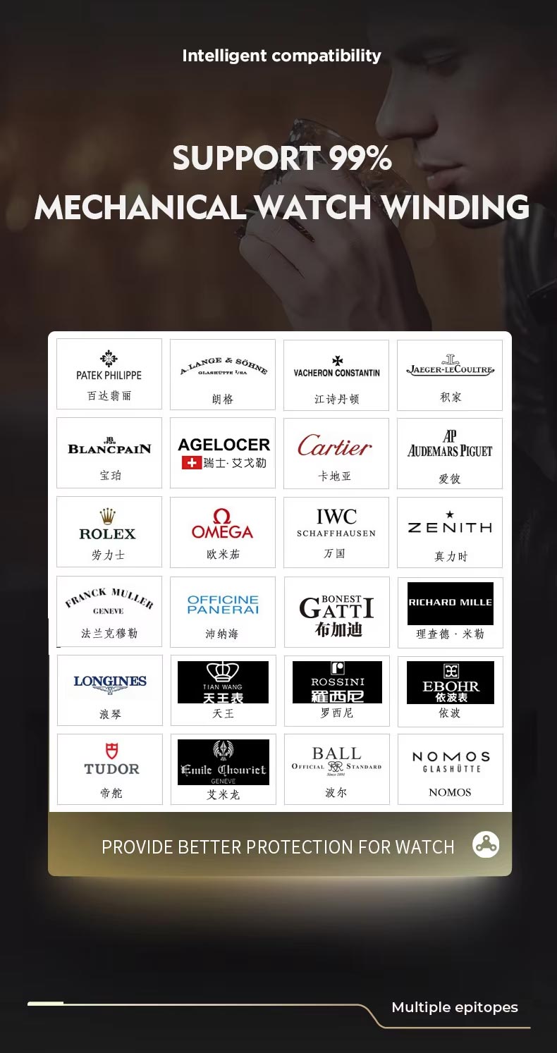 The watch winder 4 watches supports nearly all automatic watches. like Brands like Rolex, Omega, TAG Heuer, Breitling, Patek Philippe, and more are compatible, as long as the watch case fits within the pillow.