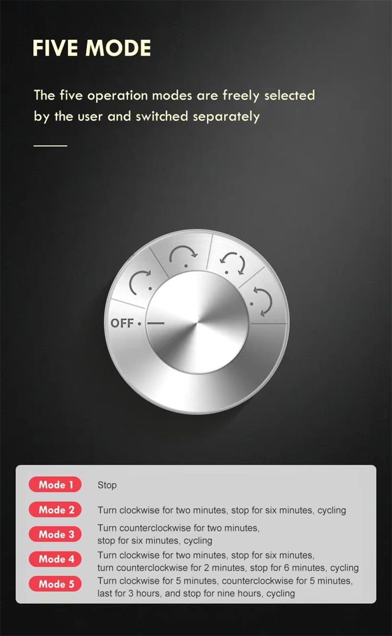 Mode 1: 6 minutes interval for every 2 minutes clockwise winding. Mode 2: 6 minutes interval for every 2 minutes counter-clockwise winding. Mode 3: 6 minutes interval for every 2 minutes counter-clockwise winding + 6 minutes interval for every 2 minutes clockwise winding. Mode 4: 180 minutes interval for every 10 minutes bi-directional winding. |