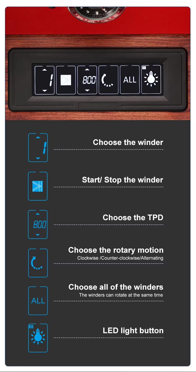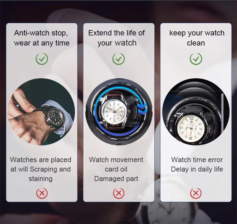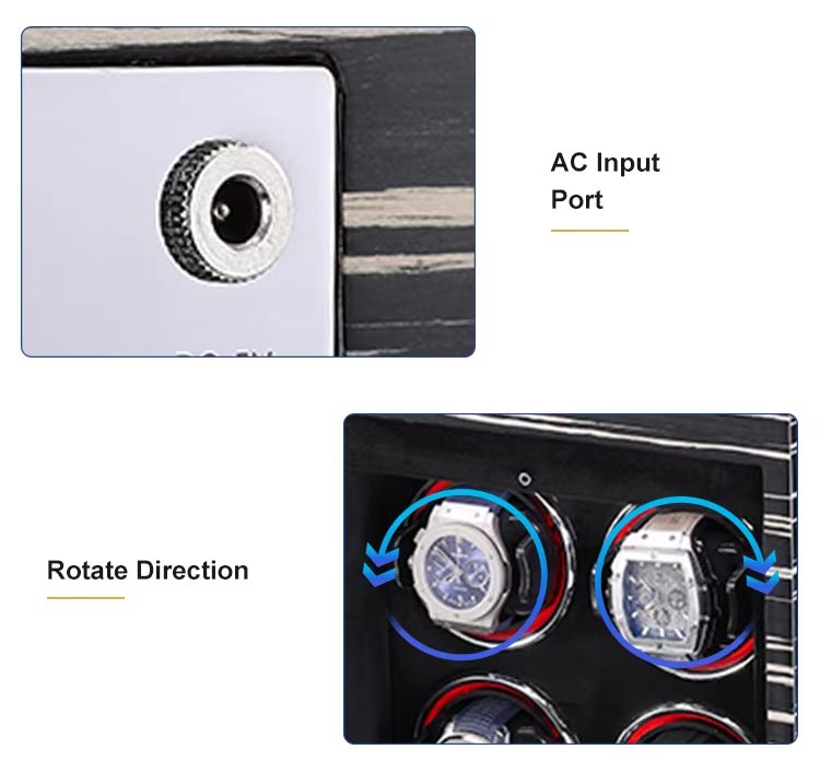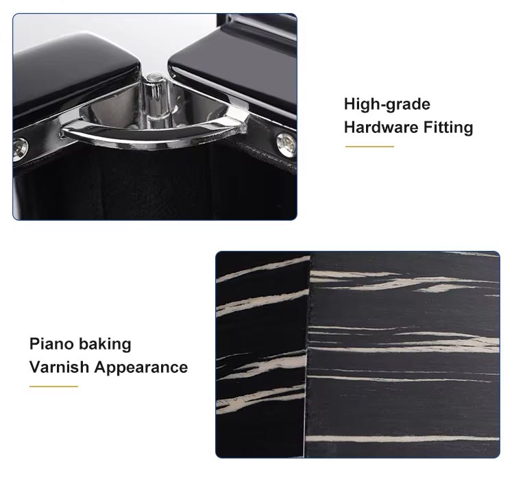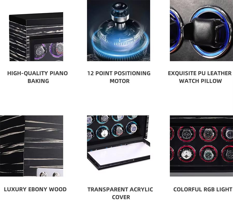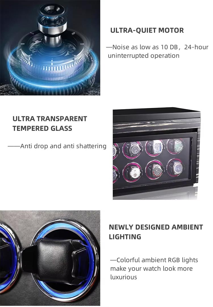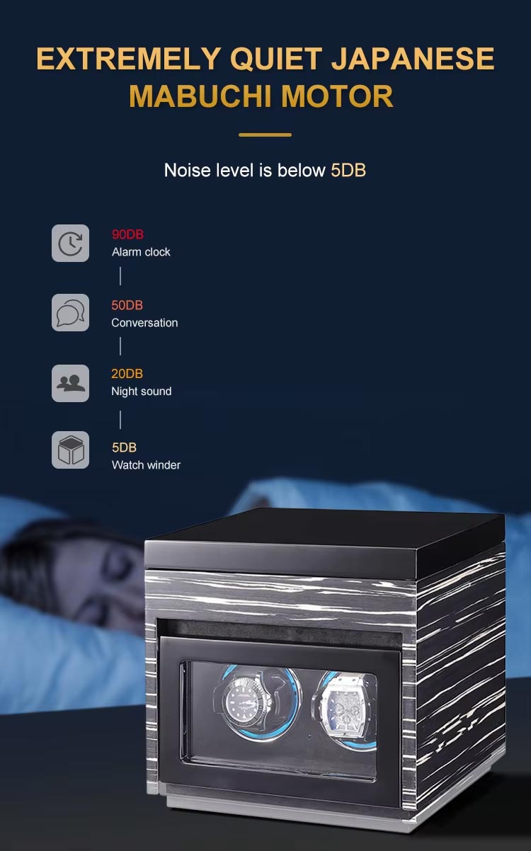 The Automatic Double Watch Winder with Storage is the perfect solution for watch collectors who value both performance and elegance. Equipped with a remote control and a smart LCD screen, this luxury double watch winder box makes it easy to adjust TPD (turns per day) and rotation directions to suit different automatic watches. The built-in LED lighting adds a modern touch, while the ultra-quiet Japanese Mabuchi motor operates at less than 5dB, making it an ideal silent watch winder for bedroom use. Its spring-loaded telescopic watch pillows ensure a secure fit for various watch sizes, while the 4 extra storage compartments keep your collection organized. For safety and convenience, the winder features an auto-stop function when the door is opened. A perfect choice for anyone seeking a luxury watch winder with storage that combines technology, security, and style.